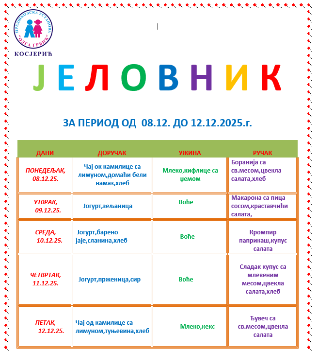 ЈЕЛОВНИК ЗА ПЕРИОД ОД 08.12.2025. ДО 12.12.2025. ГОДИНЕ