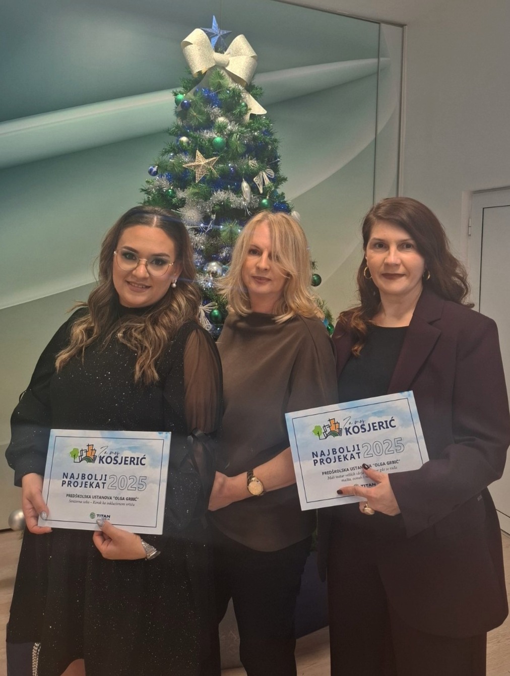 У оквиру конкурса ,,За мој Косјерић“ наша установа је награђена за два пројекта: ,,Мали театар великих идеја“ и ,,Сензорна соба-корак ка инклузивном вртићу“, од стране Титан Цементаре Косјерић. Захваљујемо се Титан цемеентари Косјерић на препознавању потребе за улагањем у лепшу и инспиративнију средину за најмлађе суграђане.